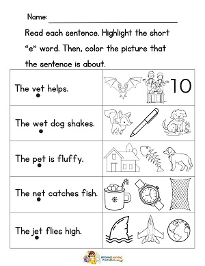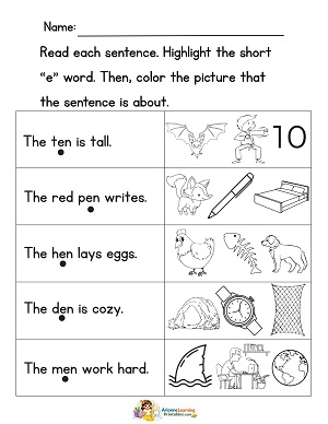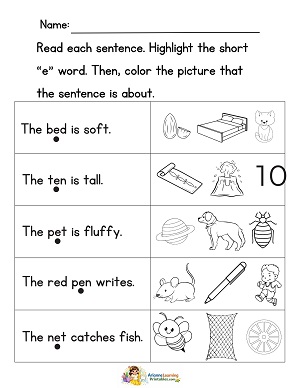 Read each sentence. Highlight the short e word. Then, color the picture the sentence was about.