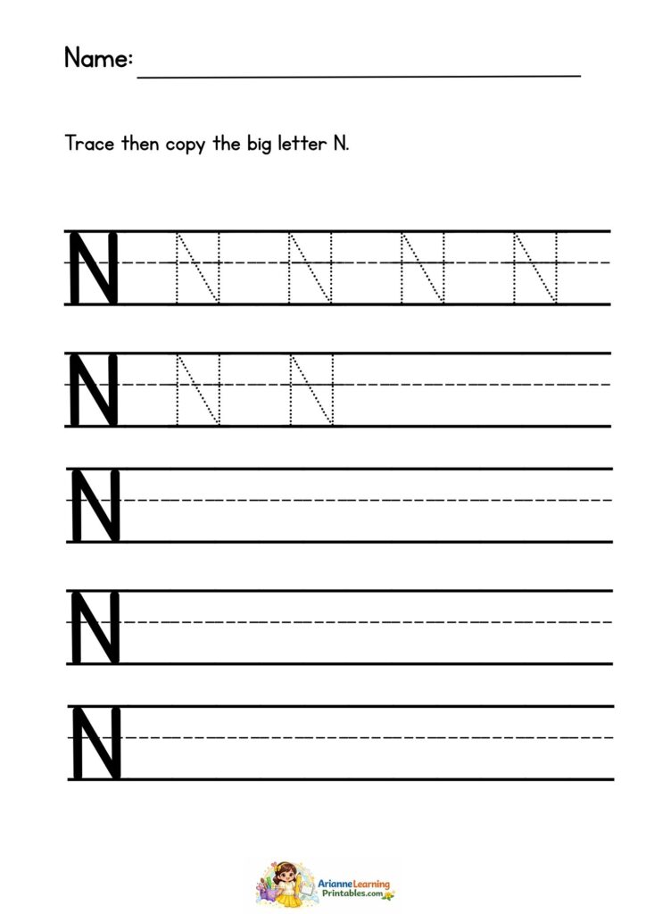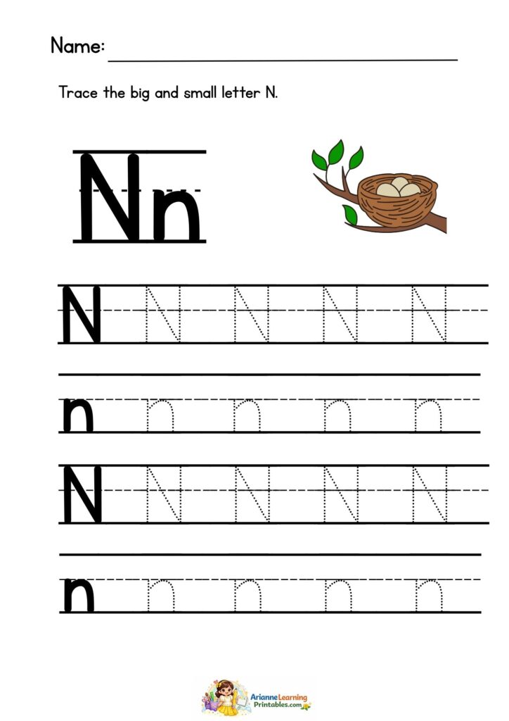 This worksheet gives children structured tracing practice to confidently form both the big letter N and the small letter n.